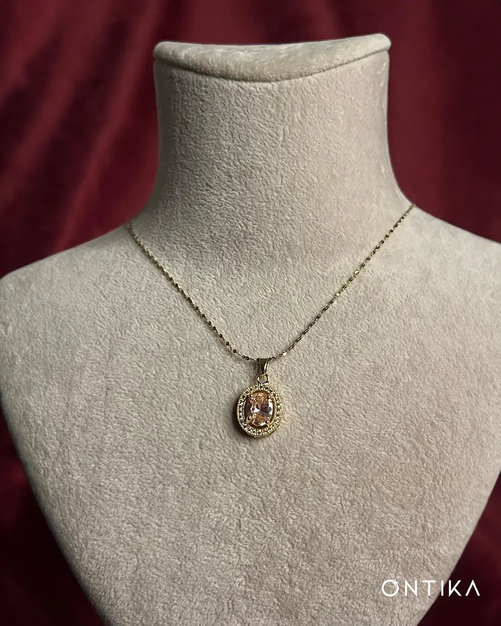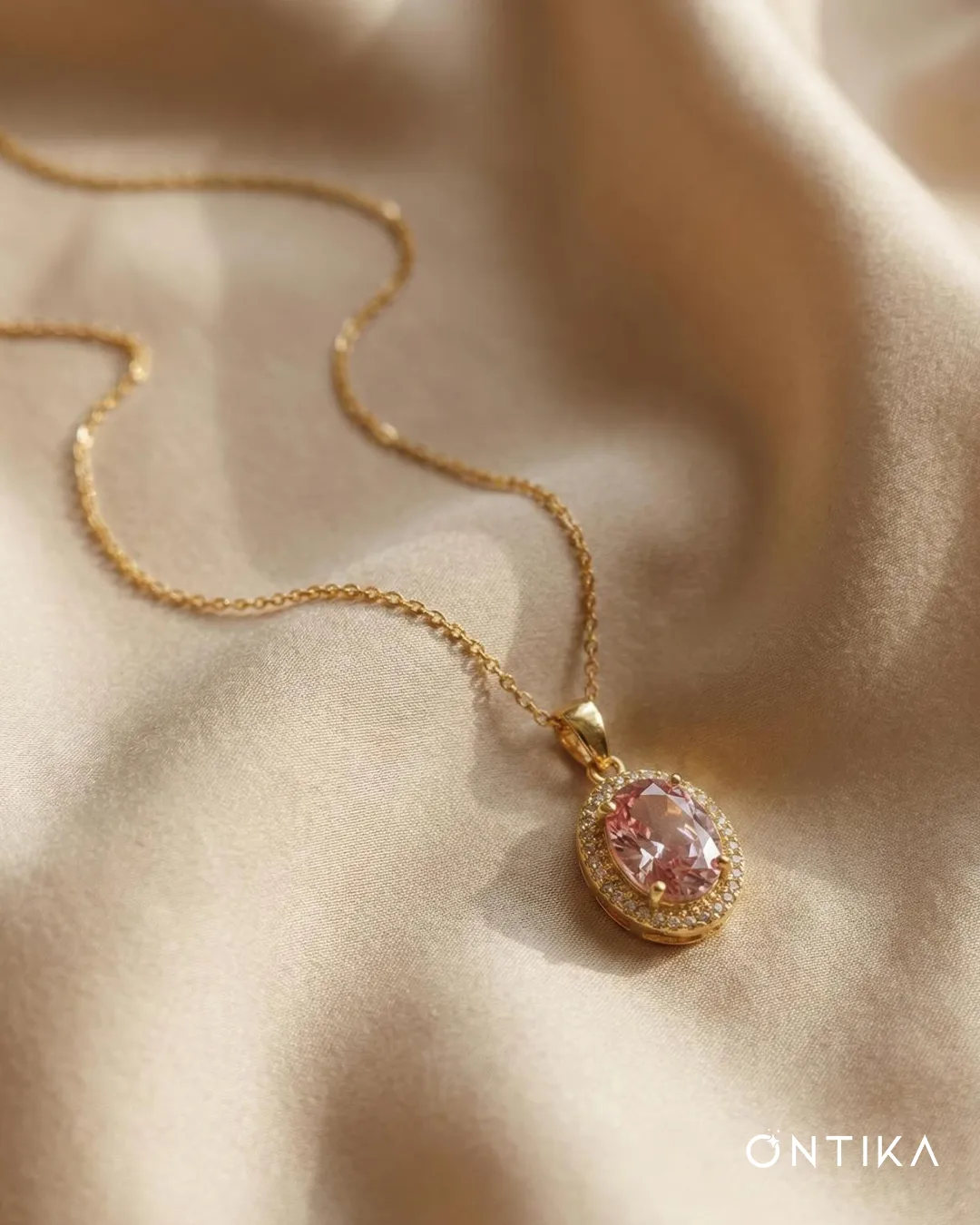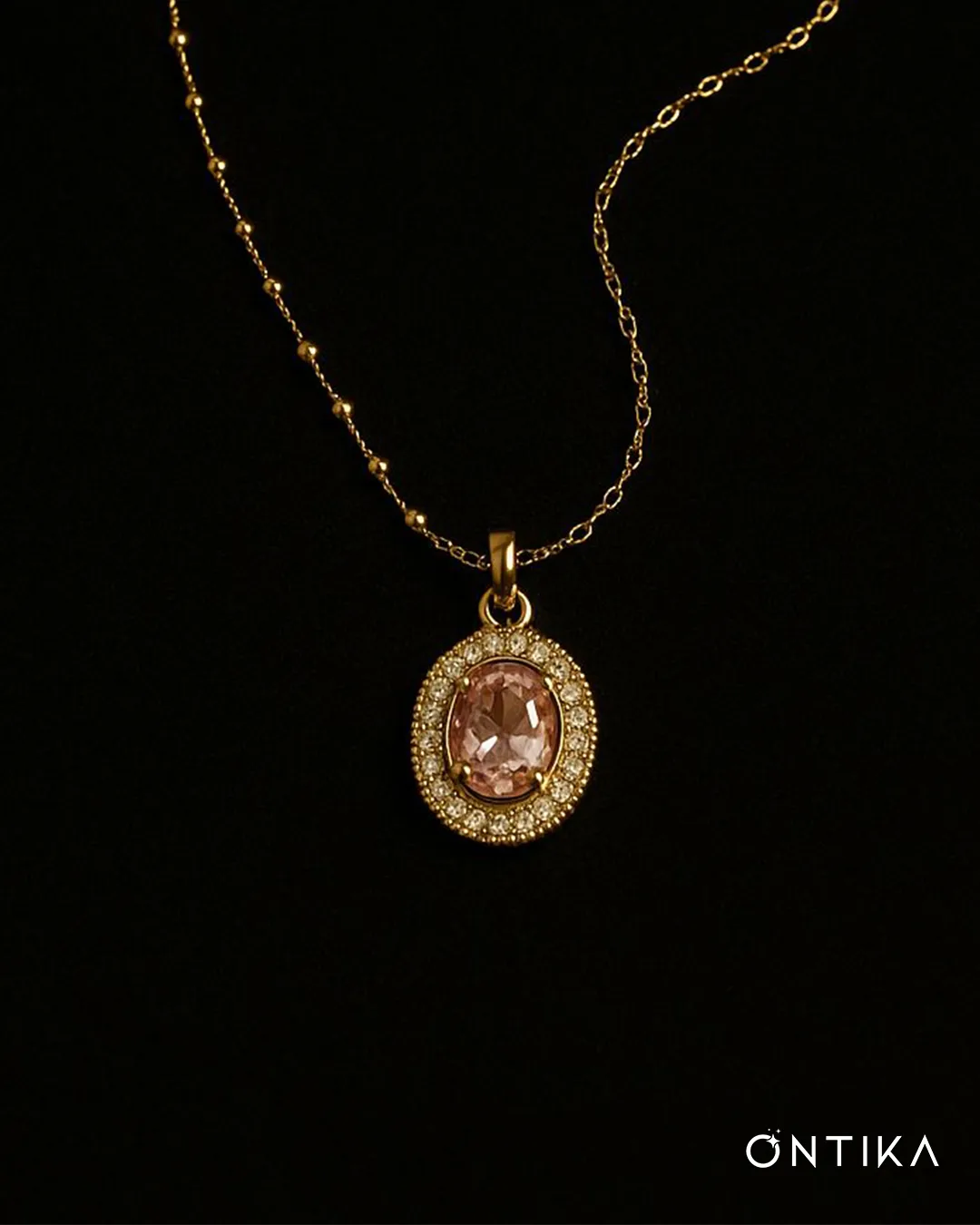 Altın rengi ve rodyum kaplama zinciri, ışıltılı detaylarla çevrili oval kesim pembe taşıyla bu Rosé Aura Kolye; zarif, modern ve göz alıcı bir şıklığı her anına taşır.