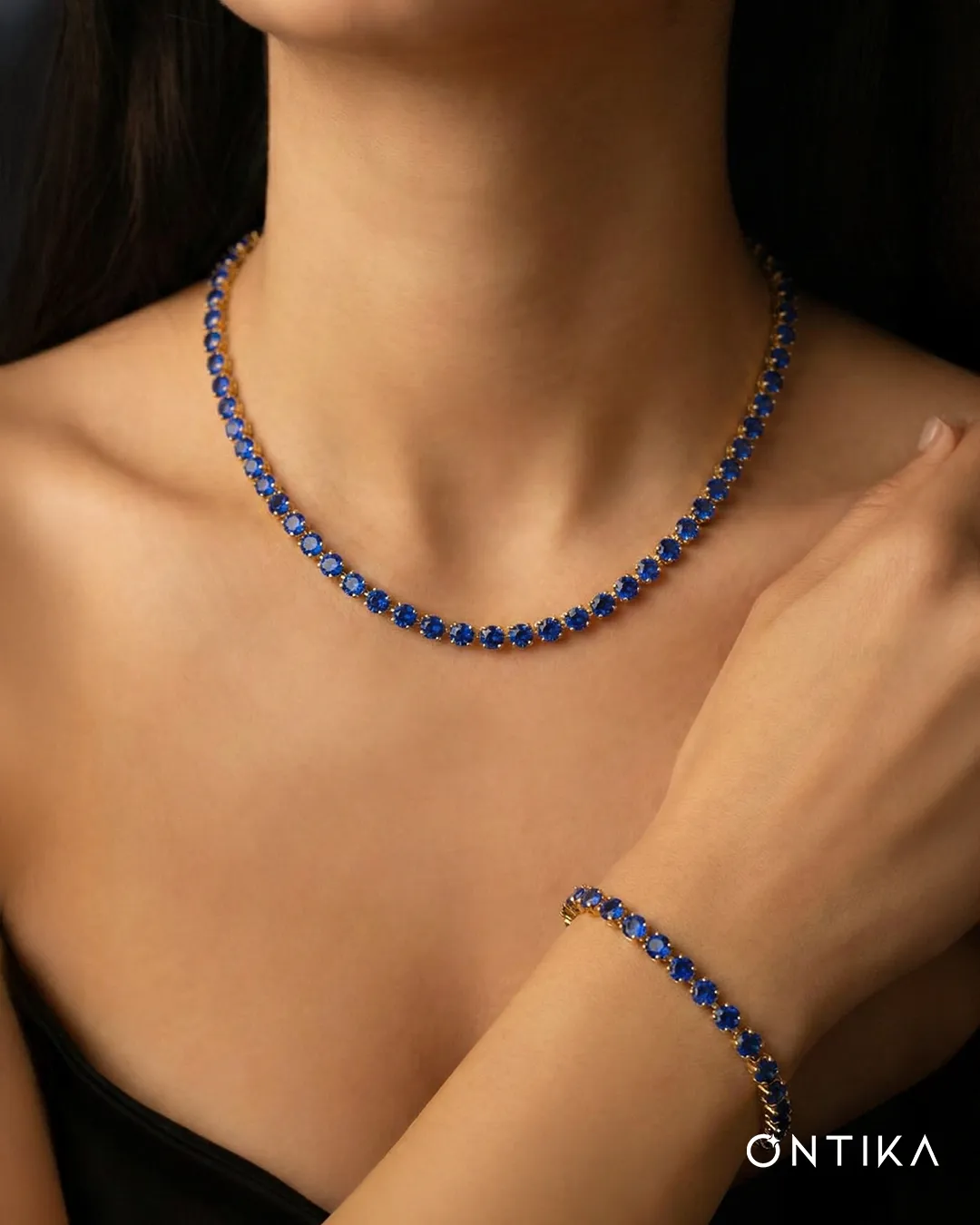 Altın rengi ve rodyum kaplama zincir üzerine dizilmiş derin mavi taşlarıyla bu kolye ve bileklik seti, sofistike bir ışıltıyla zarif ve güçlü bir stil sunar.